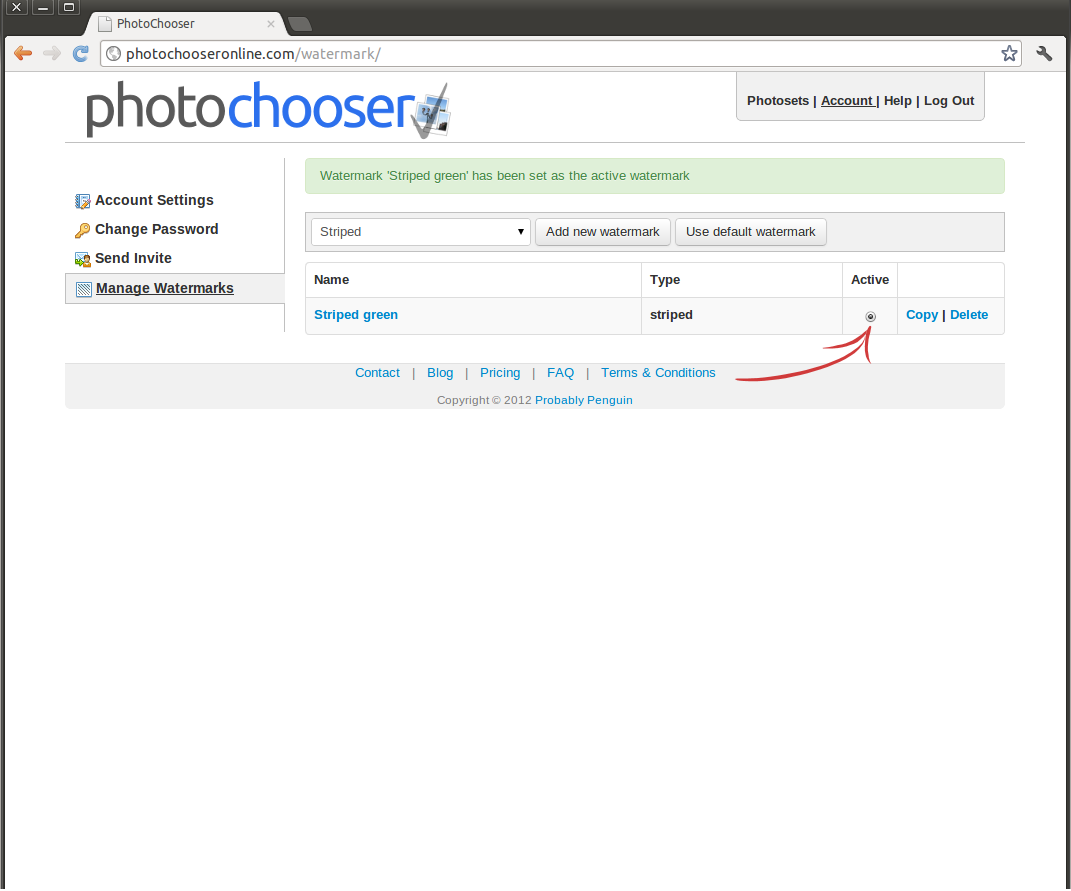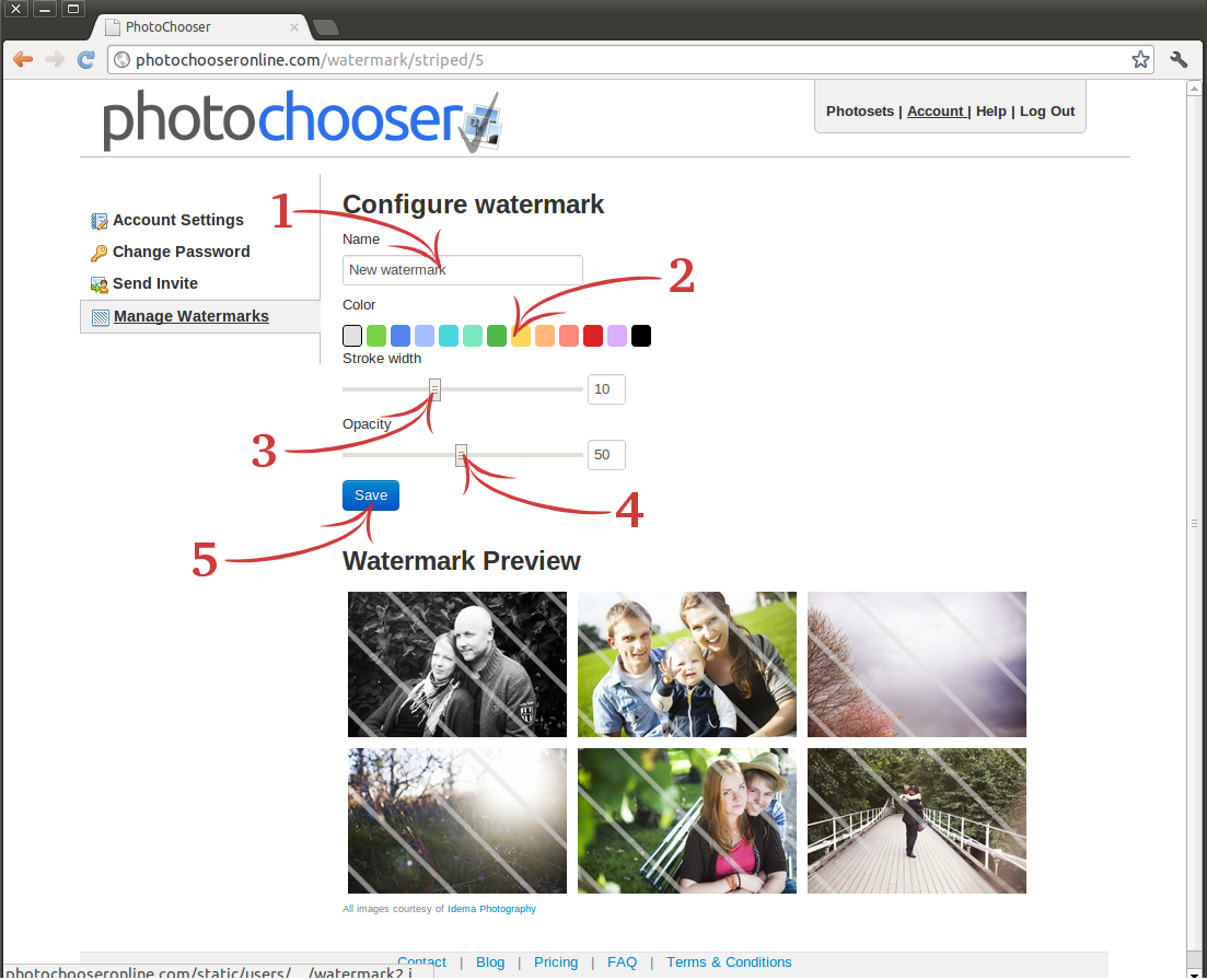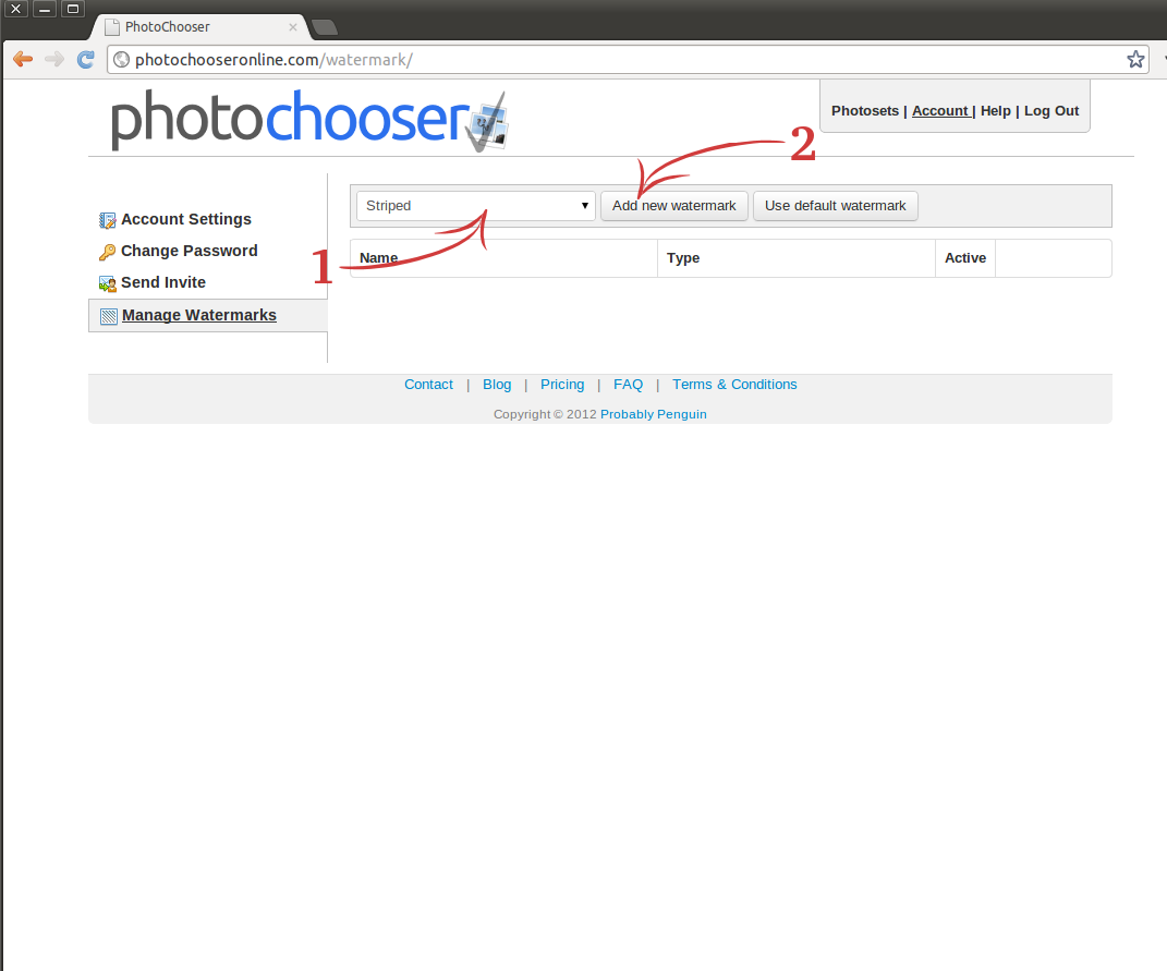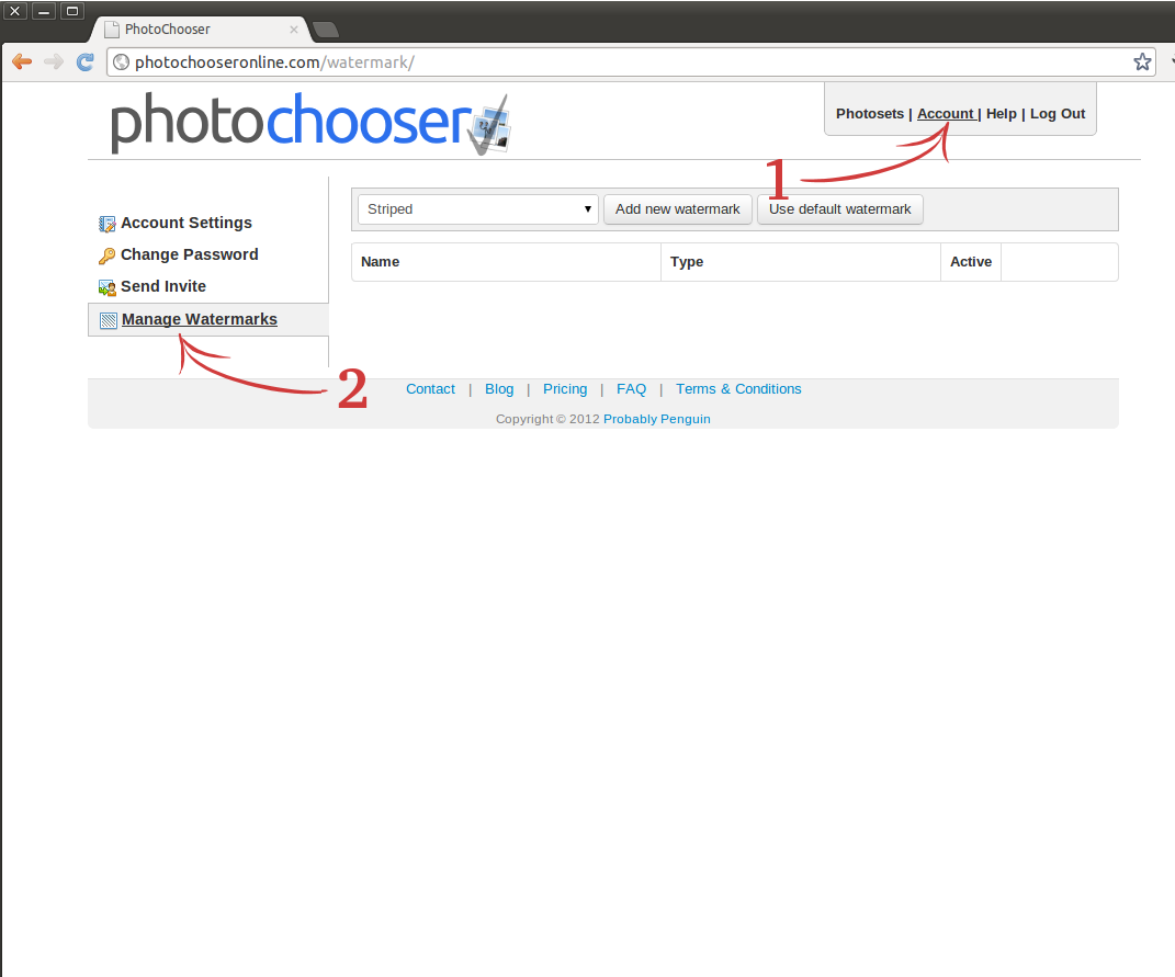 After you have logged in click Account in the top right corner (1) and then click Manager Watermarks in the left menu (2). This page show all you watermarks. Here you can make new watermarks, delete old ones and select which watermark to use.